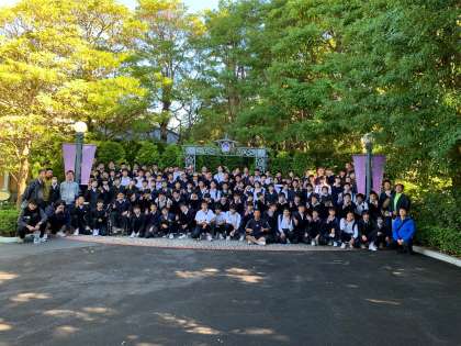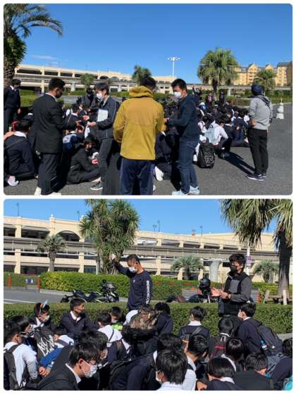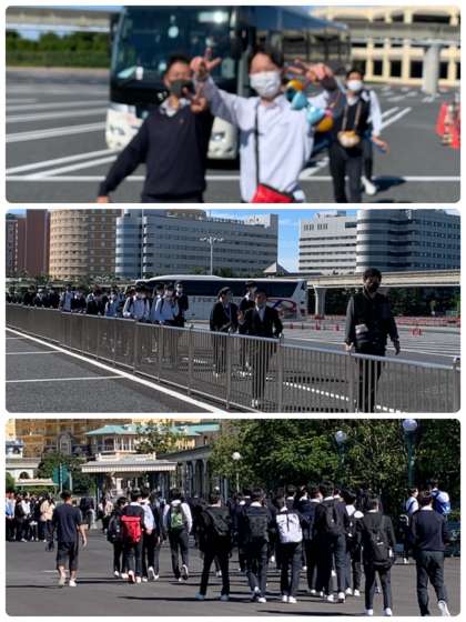 東京ディズニーランドに到着しました。入場前に男子全員での卒業アルバム用の集合写真を撮影しました。