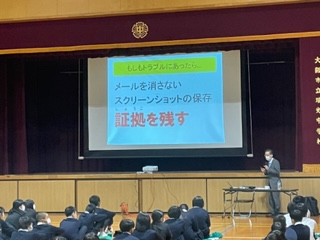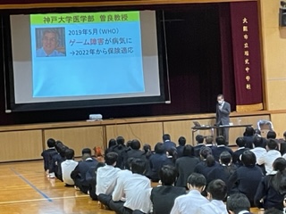 お話の後半では、「ネット依存診断」として、8個の項目をチェックしました。授業後、生徒たちも何個の項目にあてはまったのかなどお互いに話し合っている様子がありました。近年、SNS上でのトラブルが多く、生徒たちも注意してもらえるきっかけにしてもらいたいです。