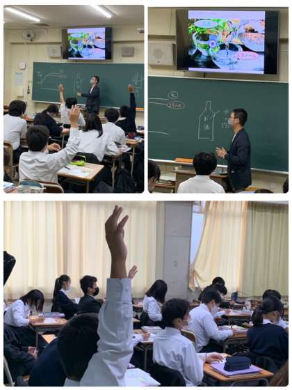 1年5組全員と頼本先生との楽しい授業でした。活気のある授業は、先生が絶えず動いて、忙しそうで、生徒たちの反応に嬉しそうにしていますね。
