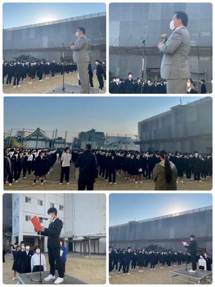 本日11月15日(月)は、少し肌寒いですが、晴天の中、全校集会を行いました。
