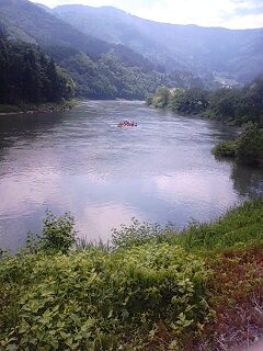生徒達はライフジャケットを着用し、中に水着を着ています。川の流れは穏やかで、ラフティングとしては安全性が高いです。指導員さんも同乗しています。