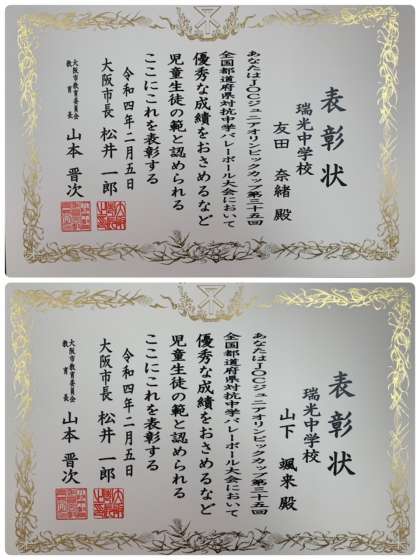 本日2月21日(月)の放送による全校集会では、全校生徒との朝のあいさつの後、JOCジュニアオリンピックカップ第35回全国都道府県対抗中学バレーボール大会に大阪北選抜チームの一員として出場し、優勝した山下さん・友田さんに対しての大阪市長・大阪市教育委員会教育長表彰の表彰伝達を行いました。