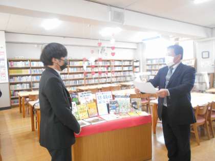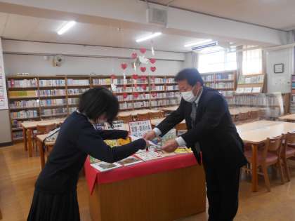 今日は、昼休みに多読賞の表彰が図書室で行われました。阪井校長先生より表彰状が手渡されました。