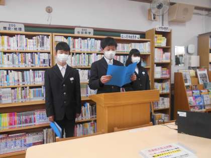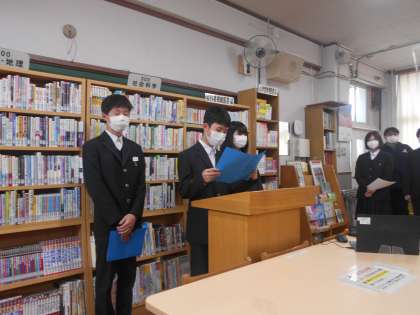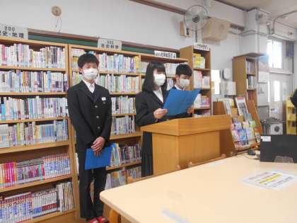 図書室からオンラインで各教室に中継し、卒業生代表から在校生へのメッセージと感謝の気持ちが伝えられました。