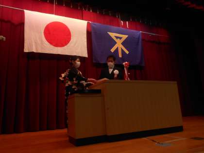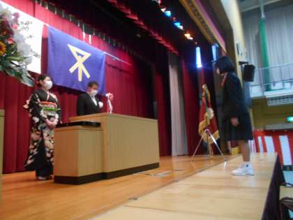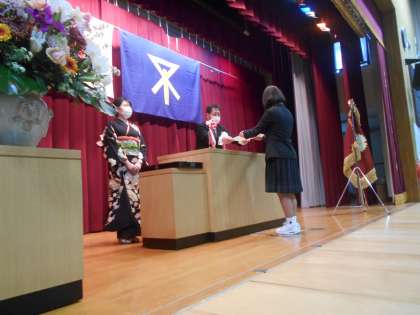 阪井校長先生と山本先生が壇上で生徒に卒業証書を授与します。