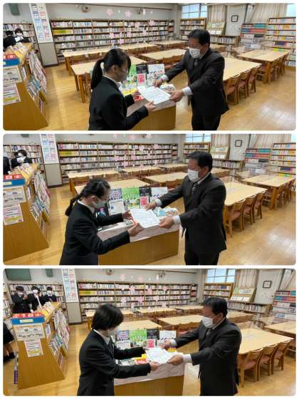今日は1年間で百冊以上読書をした生徒への表彰が行われました。学年別に行われ、3年生は卒業式前に行われました。今日は1・2年生の表彰です。1年生が2人、2年生が1人表彰されました。おめでとうございます。来年もたくさんの人がたくさんの本に出会えるといいですね。