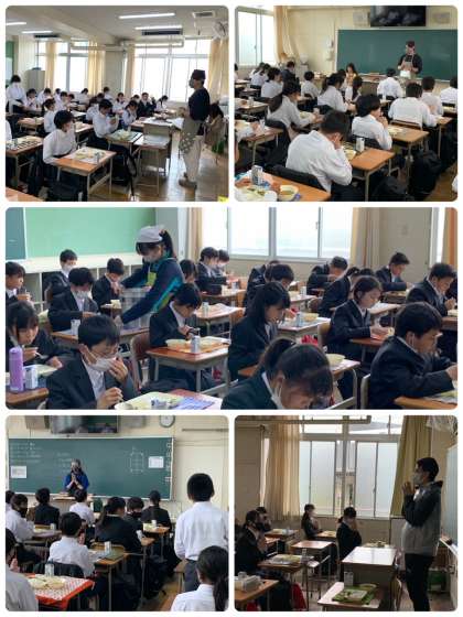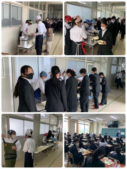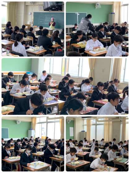 1年生は、中学校に入学して、初めての給食を食べました。給食は小中学校ともに同じなので、食べることに関しては同じですが、初めてのクラスでの給食なので、凄く緊張感のある準備でした。黙食なので、各自が黙って食べていました。