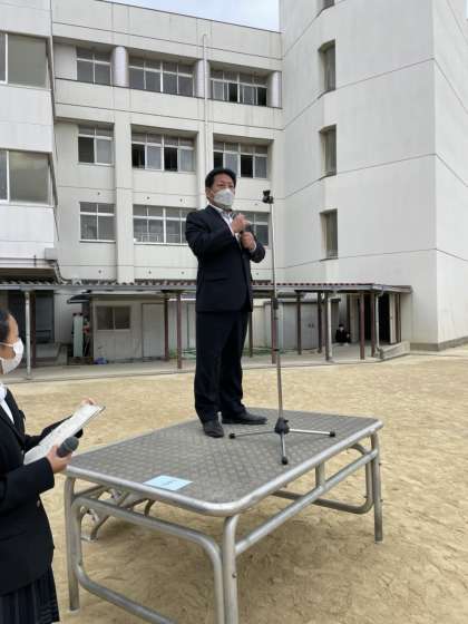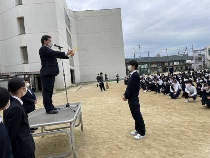 松下生徒会長より2週間後にある中間テストに向けて気持ちを切り替えて準備していきましょうという話がありました。また、毎週火曜日に行っているエコ活動で現在3660個のペットボトルキャップが集まっていますとの報告がありました。