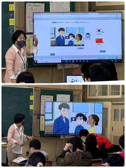 外国人の子どもたちが英語で挨拶をし、会話をする授業でした。電子黒板の画像や動画がなければ、少し早口なので何を言っているのか、分かりにくい会話ですが、6年生の児童たちは全員、理解していました。