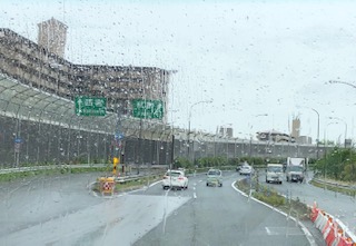 この後、桂川SAでトイレ休憩する予定です。雨のほうは強くはないですが、続けて降っています。桂川SA到着時に1日目前半の行程を雨プログラムにするかどうかを決定します。