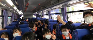 高速道に入るまで少し道路が混んでいましたが、バスの車内はみんな元気です。1号車(2組、1組分乗)では石村先生セレクトの音楽を楽しんでいます。