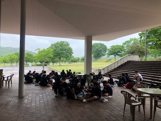 アスレチック無事に終了しました。1日目の昼食はお弁当です。いただきます!まだ黙食はしっかり守っています。