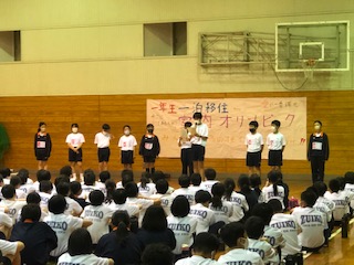 楽しかった室内オリンピックも閉会式です。学年主任西山先生からもレク係の人の頑張りとすばらしい準備を、またみんなが最後までいい雰囲気で盛り上げてくれたことをほめてくださりました。