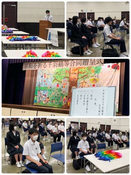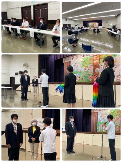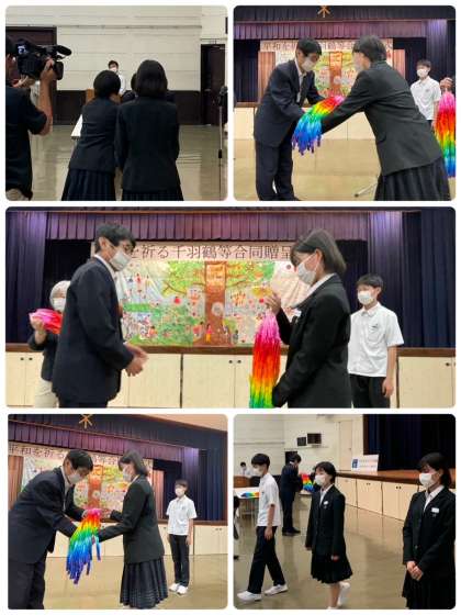 淡路中学校の平和を祈る千羽鶴の取り組みから、東淀川区内中学校生徒会、小学校児童会等へ活動を呼びかけ、西淡路小学校からこの春卒業した6年生が作成した「ゲルニカ」(舞台上に展示)、千羽鶴は第一段として、瑞光中学校生徒会、淡路中学校7者リーダー会議、小中一貫校むくのき学園生徒会、西淡路小学校児童会から西山区長に贈呈されました。