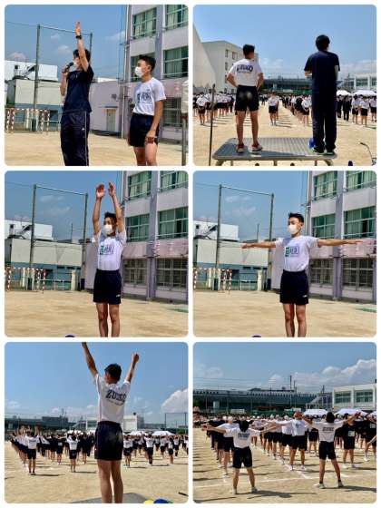 全学年が揃って、一つの集団となって移動する入場行進は迫力があり、見応えがありました。退場練習をして水分補給、休憩の後、ラジオ体操の練習を行いました。
