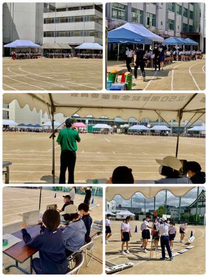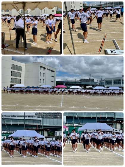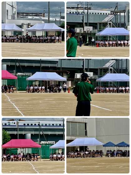 熱中症対策として、こまめな水分補給連絡と生徒席すべてのテント設営をしています。本校テントに加えて、校区小学校にテントをお借りすることができました。ありがとうございます。