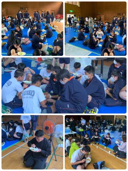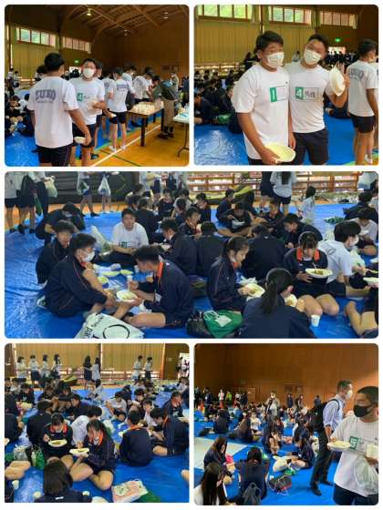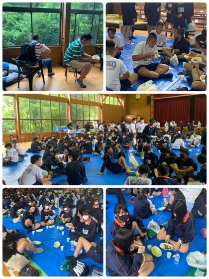 ラフティング会場に到着し、体育館にてカレーライスの昼食です。