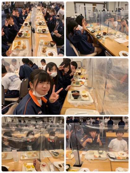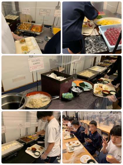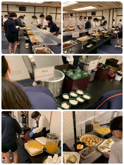 食事会場B1階レストラン「安曇野」にて夕食です。バイキング形式なので、ビニール手袋をして取り分けています。
