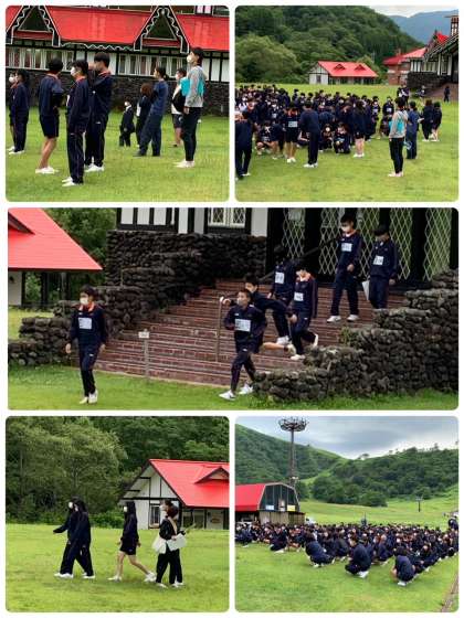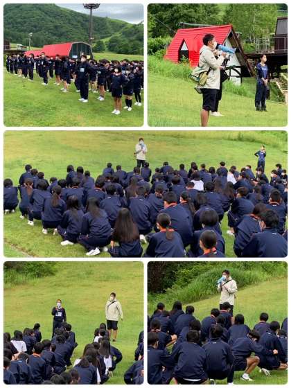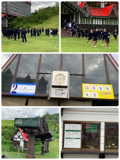 朝のつどいのためにホテル裏側のスキー場ゲレンデに集合しました。