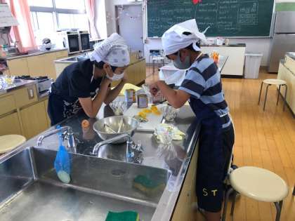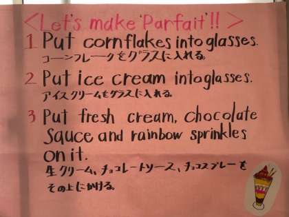 1日目は調理室にて、フルーツポンチ&パフェ作りです。たくさん英語を使って、コミニケーションをとったりしてお互い協力しながら進めています。