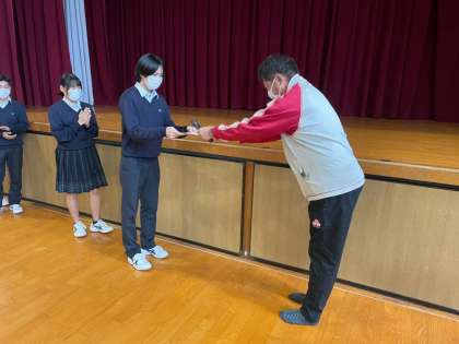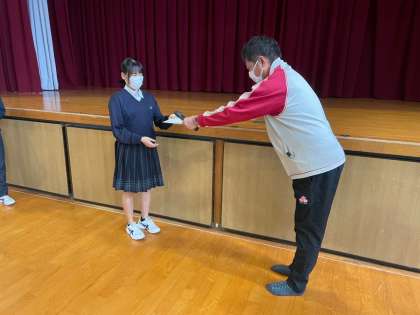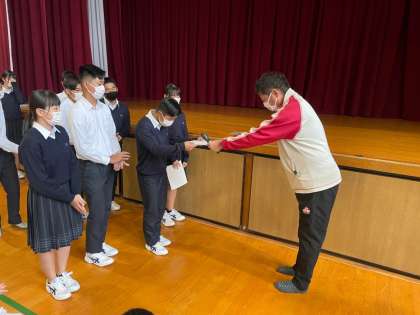 今日の3年生の学年集会では、体育大会での歴代記録を更新した表彰をおこないました。