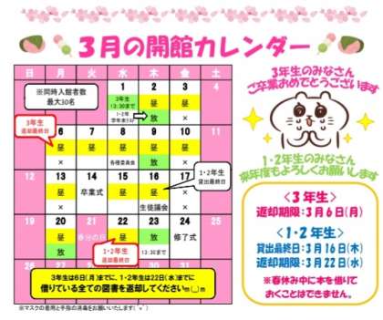 3年生の皆さんは間もなく卒業式、1・2年生の皆さんは修了式が近づいています。図書の返しそびれはないですか?