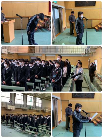 「1組の入場です。」のアナウンスにより、5組まで順番に入場し、「開式のことば」「国歌演奏」「市歌演奏」「校歌演奏」「学事報告」を行いました。