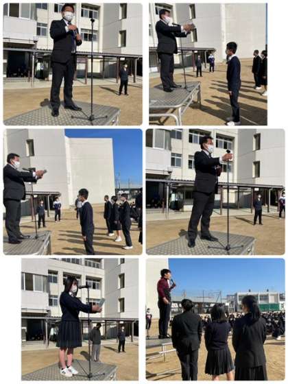 おはようございます。この半年、生徒会では、前期生徒会で行っていた取り組みやカウントダウン作成、ユニセフ募金や赤い羽根募金を行うことができました。みなさんの協力や支援があったことを嬉しく思います。ありがとうございました。さて、全校集会も今日が最終日となり、登校するのは今日を含めてあと4日となりました。先日にはロケットの打ち上げが行われましたが、昔、米国の研究者のゴダードという人は「昨日の夢は今日の希望であり、明日の現実となる」という名言を残しました。学校で過ごす日は少なくなりますが、春休みやその後の学校生活でも共通するいい言葉だなと思います。