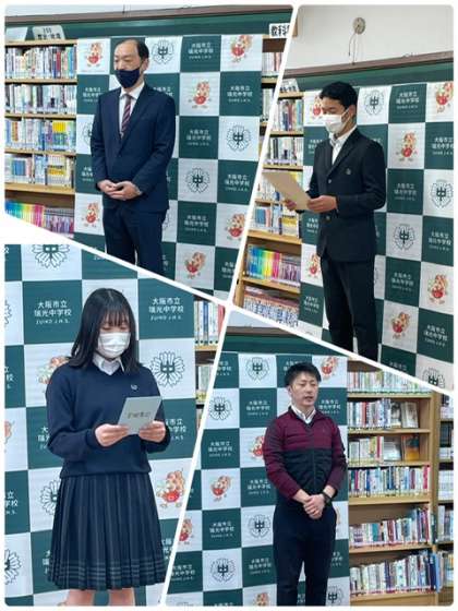 学級役員認証式も行い、福山校長先生から認証状を代表生徒に渡しました。瑞光中学校での皆さんの活躍で、すべての生徒が安心して楽しく学校生活が送れるように頑張ってください。生徒会長からは、仲間の大切さについて話がありました。