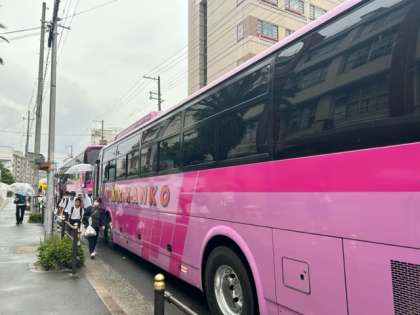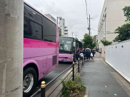 バスが学校へ到着しました。体育館で解散式を行なってから下校いたします。
