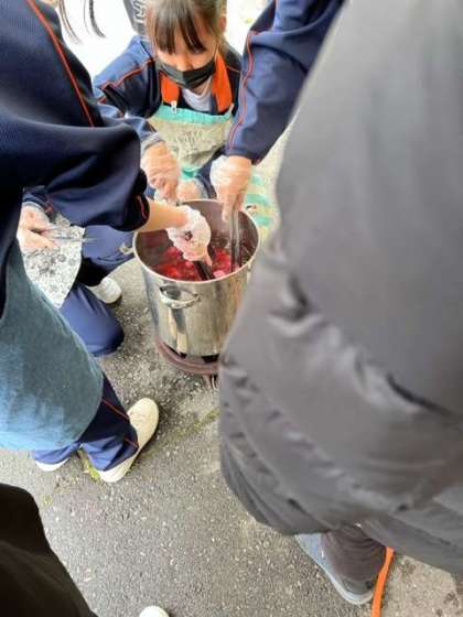 草木染めはいよいよ染め液に投入。自然が作る色なので日によって感じが変わるそうです。