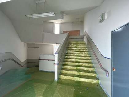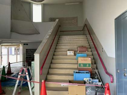 現在、営繕作業で西館のら旋階段の塗装を管理作業員さんと事業所の方で行っていただいています。ヒビや汚れで老朽化していましたが、とてもきれいに塗装していただいています。仕上がりが待ち遠しいですね。ありがとうございます。