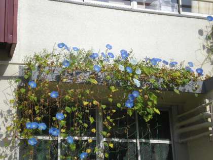 6月に壁面緑化で植えたあさがおがまだ元気に咲いていますが