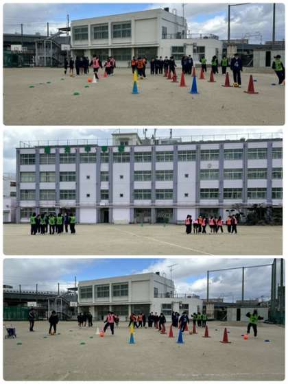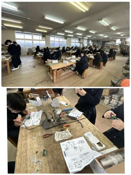 グランドでは、体育で元気にサッカーの授業を行っています。とてもうまくボールを操っていました。技術の授業では、難しい回路を作っていました。うまく作れるように真剣の表情でした。