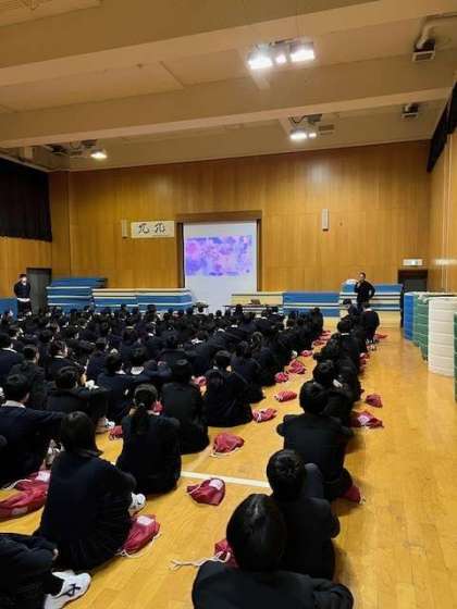 パナソニックパンサーズの事業推進部松岡様に来ていただき、2年生に職業講話を行っていただきました。選手だけでなく、スポーツにかかわる仕事についてのお話も聞くことができました。