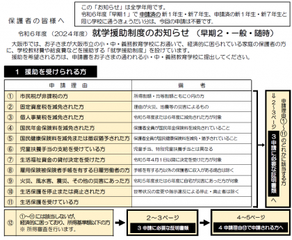 就学援助制度は、保護者負担の軽減を図るために、学校教材費や修学旅行費等を支給する制度です。