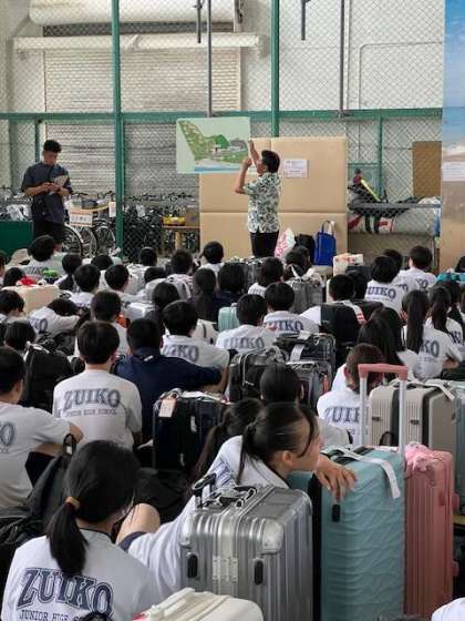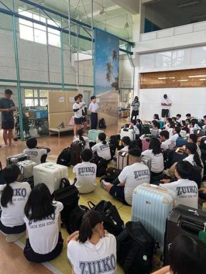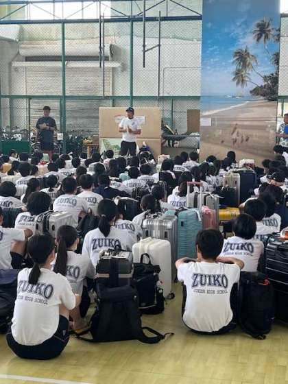民泊の方との別れの余韻に浸るまもなく、入館式を行い、ホテルの使い方の説明を受けたあとは、ビーチでの活動の説明を受けています。