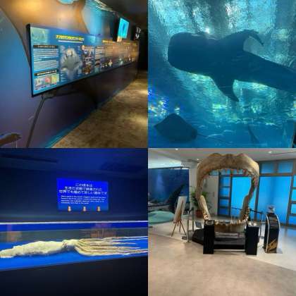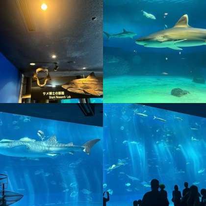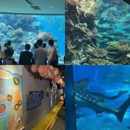 美ら海水族館を見学中です。きれいな魚たち、エイやジンベイザメのいる大きな水槽、深海の生き物などを見ることができます。