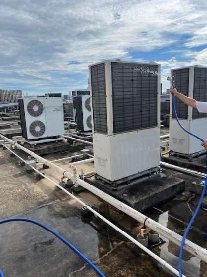早々に業者に問い合わせたところ、とりあえずの対応として、屋上の室外機に水をかけることでの対応が必要でした。