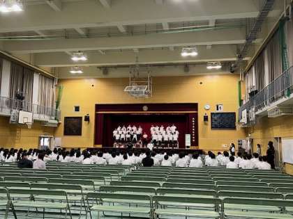 今日は全市の研究発表会のため、授業は3時間目までですが、明日が文化発表会当日のため、各学年順番に体育館で合唱のリハーサルが行われています。