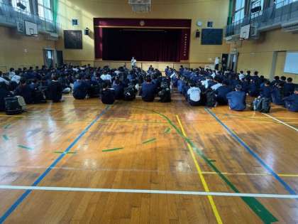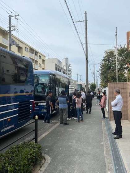 体育館で出発式を行い、バスで出発しました。