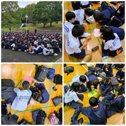 体育館で、先程終えたウォークラリーの振り返りをしています。
