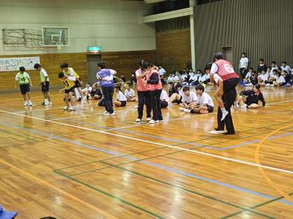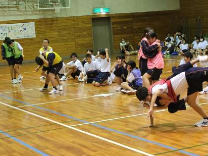 二人ペアで、新聞にのり、一回ずつ折りたたんでいき、最後まで残ったチームが勝ちです