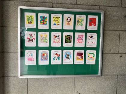 正門を入ってすぐの左手の掲示板に生徒の作品を展示しています。