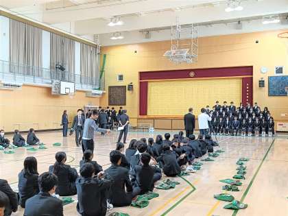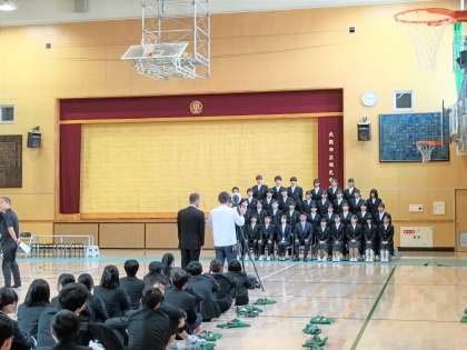 1時間目、1年生から順番に体育館で学級写真を撮影しました。新しいクラスで少し緊張している様子です。
