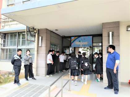 今日は、3年生の風紀委員があいさつ運動を行っています。