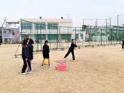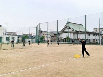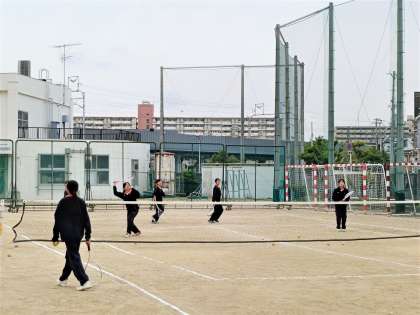 2・3年生は、ボレーの練習をしています。1年生は、バウンドしたボールを相手コートに打ち返す練習をしています。