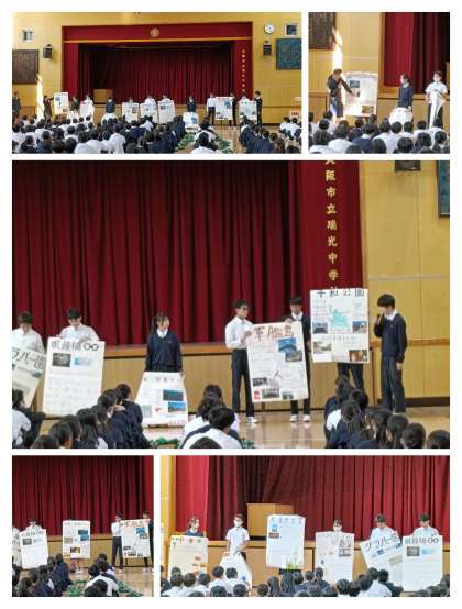 修学旅行で行く長崎の各施設などについて調べたことを模造紙にまとめ、写真やクイズで分かりやすく伝えてくれています。