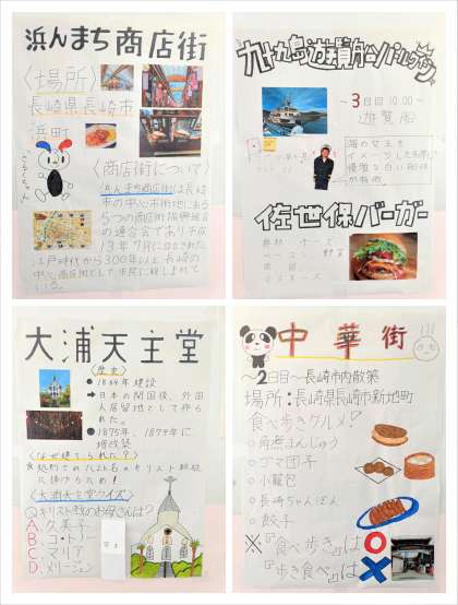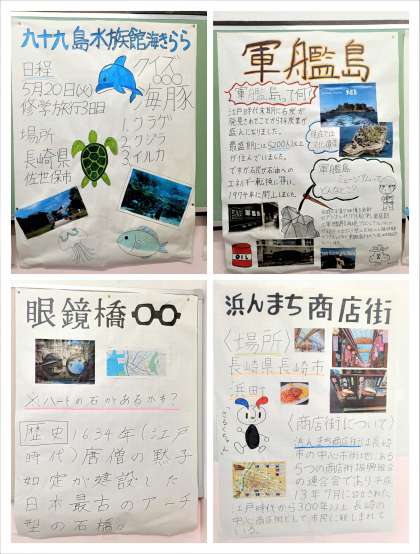 3年生学年集会では、修学旅行に向けてグループごとに並び替える練習を行いました。6時間目には、しおりを使った行程の説明がありました。写真は、学年集会の様子と3年生廊下には、修学旅行先の長崎についてまとめた模造紙が貼り出されています。