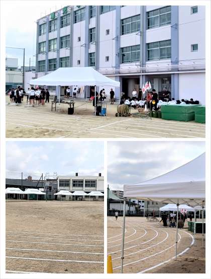昨日降った雨の影響で、少しグランド状態は悪いですが、予定通り体育大会予行を行います。朝から体育委員が集まってテントを立てたり準備を手伝っています。